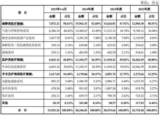 图源:公司《招股书》 01 为上千家医院供货, 年入1.6亿冲刺IPO 公开资料显示,海圣医疗成立于2000年10月,经过多年发展,目前是主营麻醉、监护类医疗器械产品的研发、生产和销售的综合产品提供商,产品广泛应用于麻醉科、ICU病房、急诊科等科室的终端临床需求。 海圣医疗的产品主要包括麻醉类医疗器械、监护类医疗器械和手术及护理类医疗器械三大类。 其中,麻醉类医疗器械是该公司的主要产品,近年来对营收的贡献度持续增长,收入从2022年的1.3亿元到2024年的1.6亿元,占比从48.51%增长至52.6%,超过一半。不过今年上半年麻醉类医疗器械的营收占比有所下降,为50.61%,实现收入7872.21万元。 监护类医疗器械产品则是海圣医疗的另一大收入来源,近年来占营收的比例维持在38%左右,今年上半年实现收入6043.16万元,占比为38.85%。 第三大收入来源则是手术及护理类医疗器械产品。今年上半年营收占比为10.4%,实现收入1617.69万元。